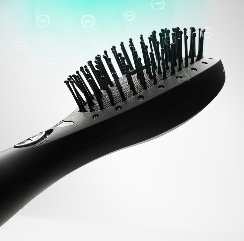 Negativni ioni so negativno nabiti delci (elektroni) v zraku, ki jih s prostim očesom ne vidimo, saj je premer negativnega iona enako velik kot tisočinka premera delčka vodne pare. So neobstojni, zato se vežejo na druge delce (prah, umazanija) in predvsem na pozitivno nabite ione (statična elektrika).S pomočjo negativnih ionov odstranimo z las pozitiven naboj, ki povzroča, da so lasje naelektreni in neukrotljivi. Ionska krtača za lase odstranjuje statično elektriko iz las že samo z neznim česanjem. Hkrati pa negativni ioni prodirajo v vsak las, ga v celoti obdajo in zaprejo povrhnjico lasu. S tem zadržujejo vlago v laseh in izboljšajo fleksibilnost las. Zato so lasje bolj vitalni, lesketajoči in zdravi. Z daljšim česanjem pa si lahko celo zravnate lase.