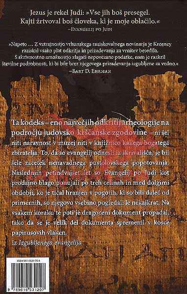 Izgubljeni evangelij, delo nagrajenega avtorja dokumentarnih filmov in pisatelja Herberta Krosneyja, je privlačna pripoved in natančno poročilo o tem, kako so pred tremi desetletji našli kodeks – ki vsebuje alternativni pogled na odnos med Jezusom in Judo – o njegovem nenavadnem romanju v poznejšem času in o tem, kako so iz starega koptskega besedila skrbno razbirali njegov pomen. Potem, ko je razpadel na skoraj tisoč koščkov, je v usnje vezani papirusni kodeks zdaj konserviran, dokazali so njegovo pristnost in ga prevedli iz stare egiptovske koptščine.