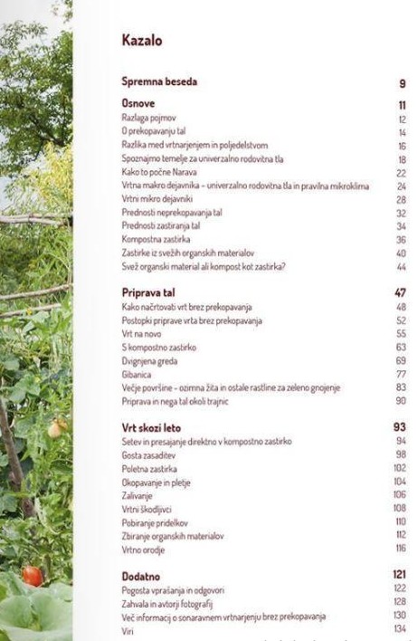 <p><span style=”font-family: tahoma, arial, helvetica, sans-serif; font-size: medium;”>Knjiga končno poda konkretne re&scaron;itve za pripravo vrtnih tal brez prekopavanja (&scaron;tihanja, frezanja, oranja) na vrtnih povr&scaron;inah do 500 m2 . Razdeljena je na 3 vsebinske dele: osnove, postopki priprave tal in sonaravna nega tak&scaron;nih vrtov skozi leto. Namenjena je vsem vrtnarjem začetnikom, da pravilno začnejo s prvimi vrtnarskimi koraki in tistim, ki si želijo z manj dela priti do bolj produktivnega sonaravnega vrta. To so na koncu koncev vsi vrtnarji ki poleti obupajo, ko morajo vedno znova zalivati, odstranjevati plevel.</span><br /><br /><span style=”font-family: tahoma, arial, helvetica, sans-serif; font-size: medium;”>Priprava vrta brez prekopavanja tal je enostavna in uspeh je zagotovljen, ko se držimo opisanih postopkov v knjigi. Praktični primeri vodijo skozi vse leto &ndash; od minimalnega vloženega truda in energije pri pripravi tal, zmanj&scaron;anja plevela in zalivanja med rastno sezono do končnih čudovitih pridelkov.</span></p>