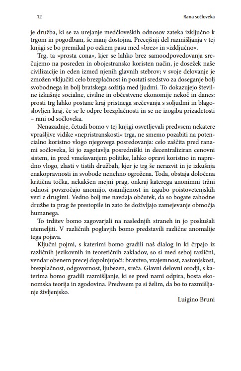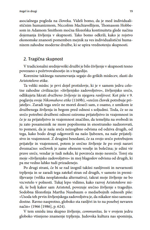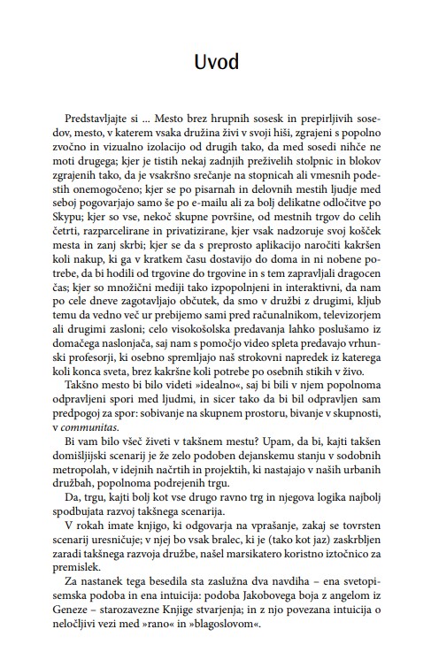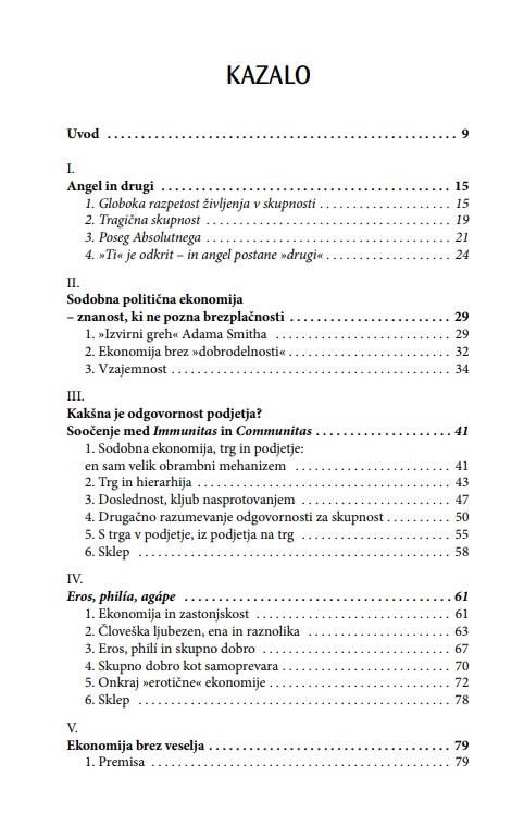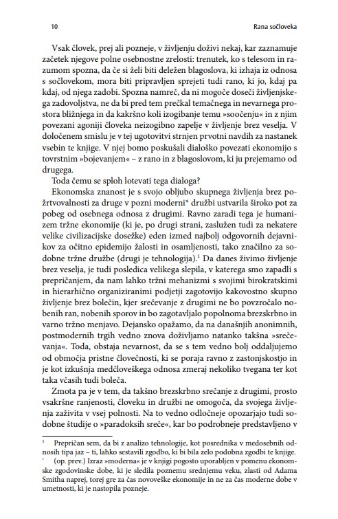 Sodobna družba, ki jo usmerja tok tržnega gospodarstva, se izogiba neposrednim medčloveškim stikom »v živo«. Zato so srečevanja med ljudmi omejena na intimne prostore, spletna omrežja ali zgolj formalne oblike. Na videz je takšno izolirano okolje idealno, saj s skupnostjo odpravlja tudi možnost konflikta, pa vendar se pravo življenje skriva prav v soočanju z drugim in v tveganju, ki ga prinaša pristna človečnost. V tej knjigi avtor povezuje gospodarstvo z naukom svetopisemske zgodbe o Jakobovem boju z angelom (1 Mz 32,23-30) – izkušnja odnosa je tista, ki povzroča rane, a prinaša tudi blagoslov.