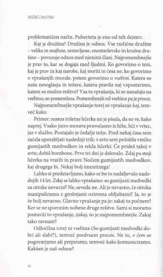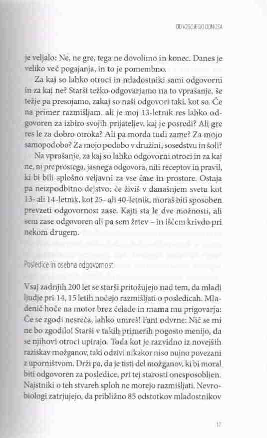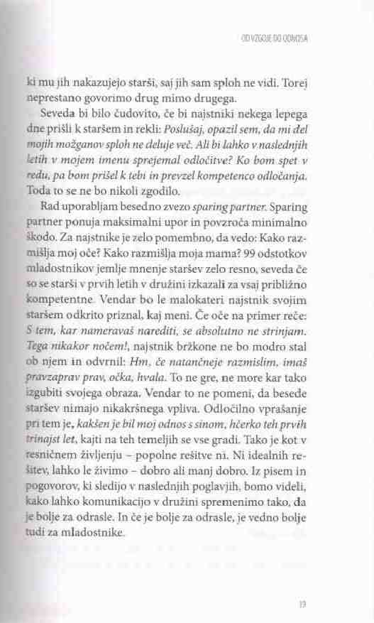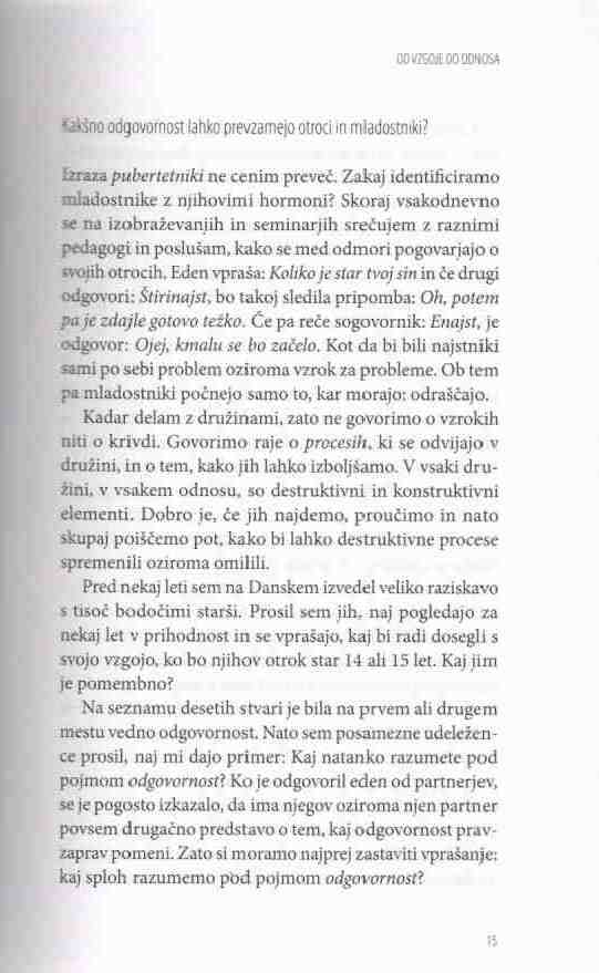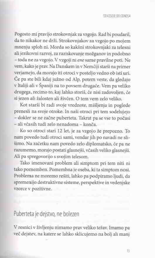 Ko pridejo otroci v puberteto, lahko dobro vidimo, kaj nam je uspelo skupaj ustvariti. Skupaj smo namre? prišli do dolo?ene to?ke. Doslej smo starši sedeli na vozniškem sedežu in otroci so z nami sodelovali. Smo zadovoljni s tem, kar je nastalo? Ve?ina staršev na žalost na tej postaji ni zadovoljnih, zato za?nejo z nekakšno turbovzgojo, s katero želijo v zadnjih minutah popravili, kar se popraviti da. To je grozno Ä in nesramno. In ne deluje. Starši se potem sprašujejo. Kaj pa naj storimo? Saj vendar ne moremo samo mirno in pasivno opazovati, kako po?nejo naši otroci stvari, s katerimi se ne strinjamo. V obdobju najstništva, od starosti 12, 13, 14 let naprej, potrebujejo otroci od nas pravzaprav le eno, da vedo, da je na tem svetu ?lovek ali dva ?loveka, ki zares verjame, da sem v redu. To potrebujejo. Veliko nas v življenju ni imelo takega ?loveka. ?e imaš enega, lahko dobro preživiš, z dvema lahko ?udovito živiš. Toda to ni naša starševska tradicija. Raje se obnašamo kot u?itelji, sedimo z rde?im svin?nikom v roki in gledamo, kaj bi na svojih otrocih še morali popraviti.