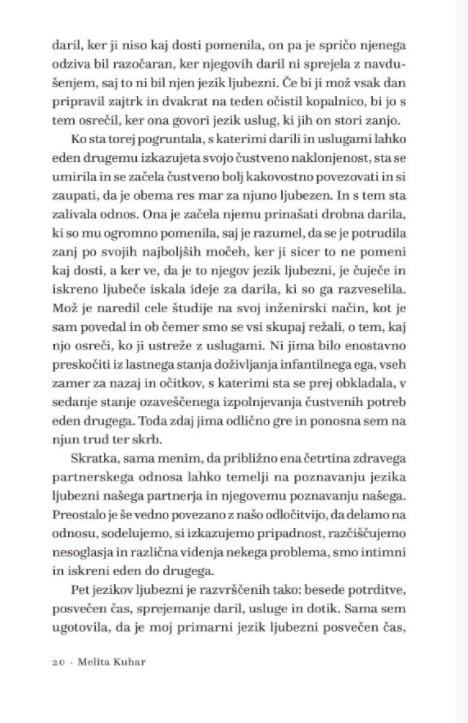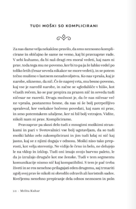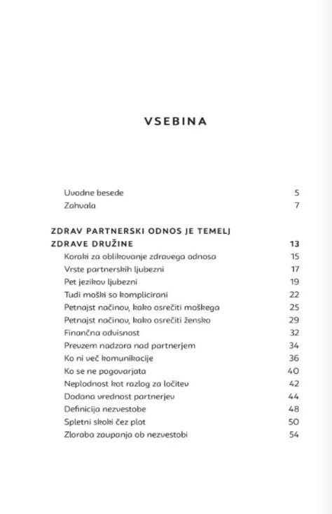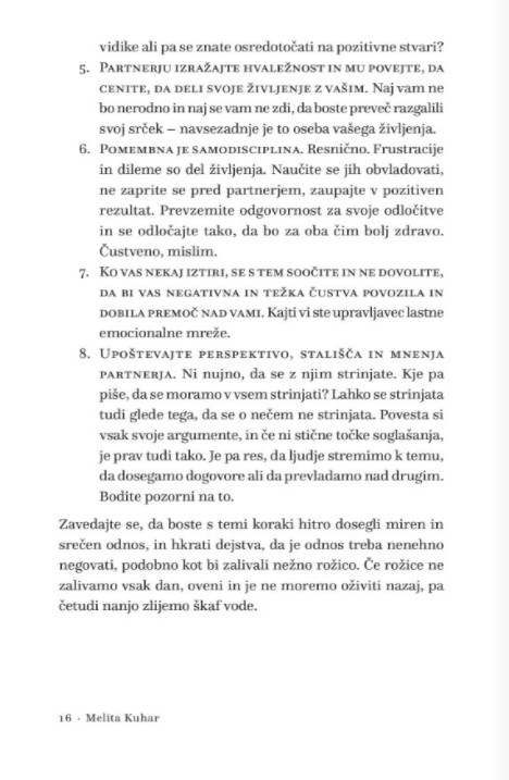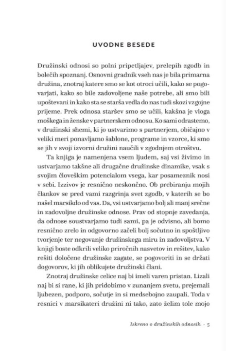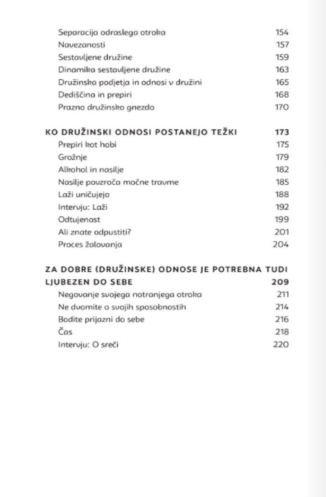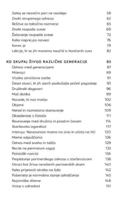 V tej knjigi boste našli obilo zgodb slovenskih družin, v katerih se prepletajo različne čustveno težke situacije, za katere Melita znotraj svetovalnega procesa vedno najde zdrave in konstruktivne rešitve. Družinski odnos je vedno zelo dinamičen, saj ga tvorijo popolnoma različni posamezniki, vsak s svojimi osebnimi značilnostmi, hotenji, potrebami in željami. Rdeči niti povezovanja družine pa sta ljubezen in sodelujoča komunikacija.