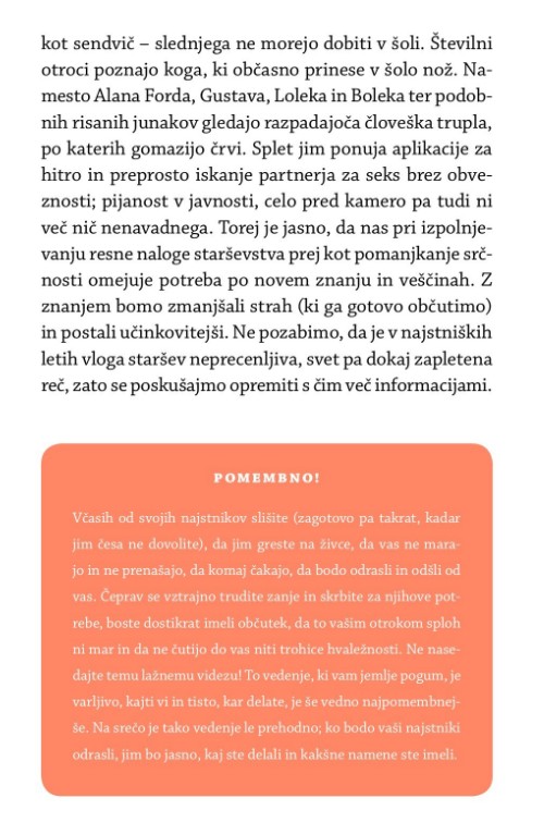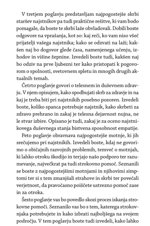 V njem boste našli zlata pravila skrbi za najstnike, opis najpogostejših napak, ki jih starši delajo pri vzgoji najstnikov, in najpogostejših najstniških težav, nasvete za obravnavanje značilnih »najstniških« tem, kot so prva ljubezen, spolnost, šola, vrstniško nasilje, internet, pomoč doma, prijatelji, ločitev staršev, skrb za videz ipd., izvedeli pa boste tudi, katere so »običajne« tegobe odraščanja in pri katerih bi bilo dobro poiskati strokovno pomoč.