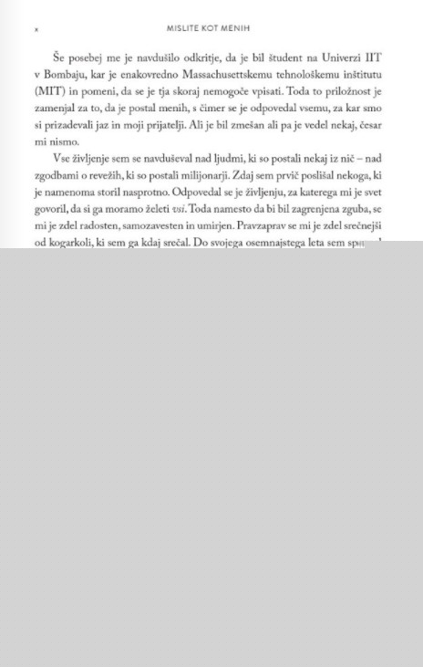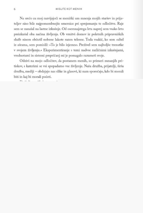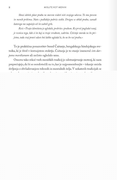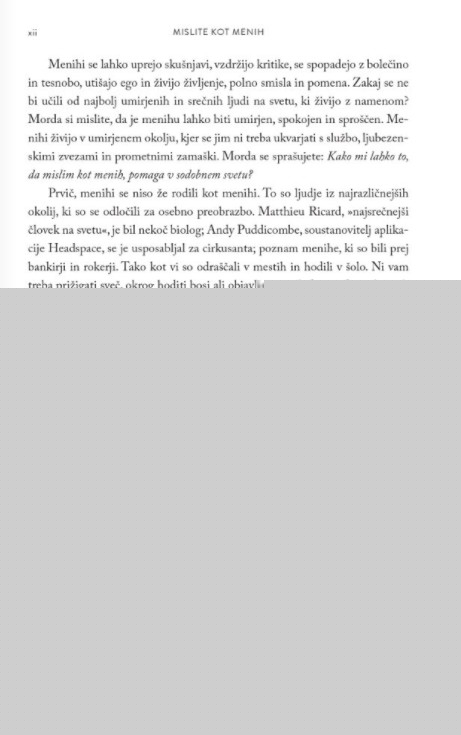 Ta knjiga je vodnik do tega, kako lahko VSAK začne misliti kot menih in postane bolj pogumen, sočuten in odločen. Misliti kot menih v tem hitrem svetu, polnem stresa, namreč ni več izbira, ampak že kar nujnost.