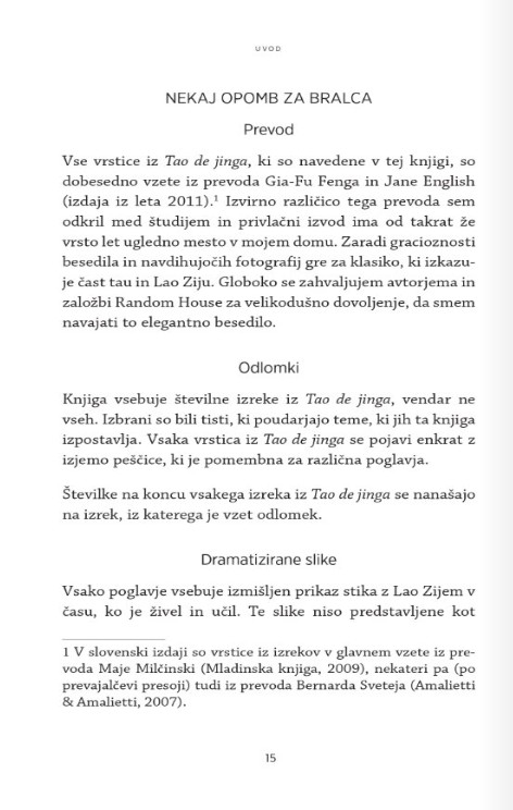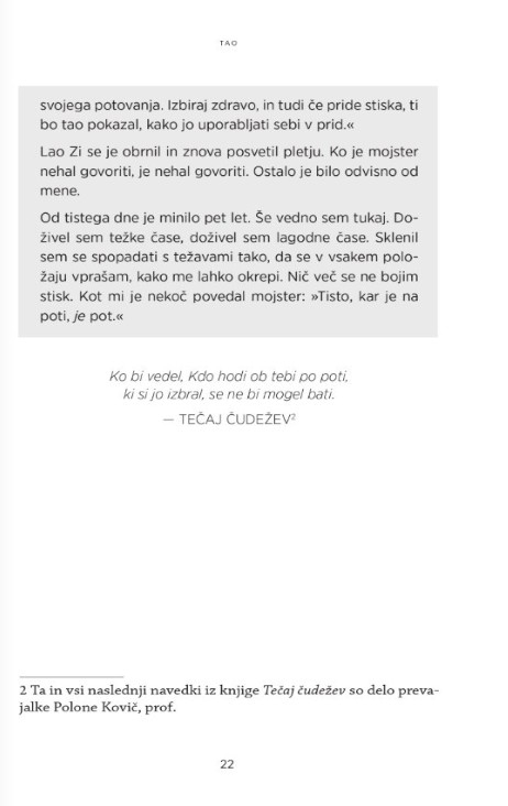 Tao de jing ponuja ene izmed najkoristnejših vpogledov v to, kako živeti, kar jih je kdaj zapisalo kakšno človeško bitje. Knjižica starega mojstra z zgolj 5000 pismenkami prepoznava vir človekovega trpljenja in zdravilo zanj; z izjemo Svetega pisma velja za največkrat prevedeno, interpretirano in natisnjeno knjigo v zgodovini. Lao Zi je osupljivo jedrnato zasadil časovno kapsulo za zdravljenje, ki je nismo še nikoli bolj potrebovali.