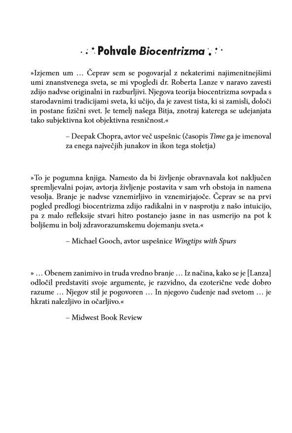»Izjemen um … Čeprav sem se pogovarjal z nekaterimi najimenitnejšimi umi znanstvenega sveta, se mi vpogledi dr. Roberta Lanze v naravo zavesti zdijo nadvse originalni in razburljivi. Njegova teorija biocentrizma sovpada s starodavnimi tradicijami sveta, ki učijo, da je zavest tista, ki si zamisli, določi in postane fizični svet. Je temelj našega Bitja, znotraj katerega se udejanjata tako subjektivna kot objektivna resničnost.«
