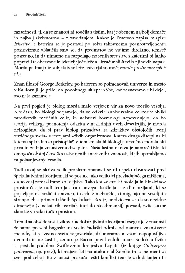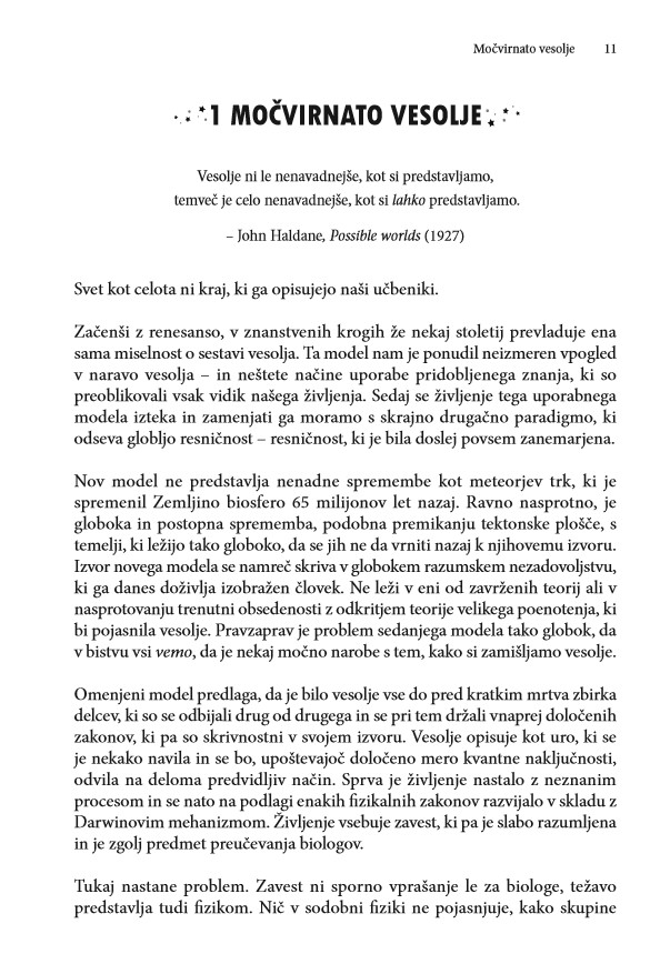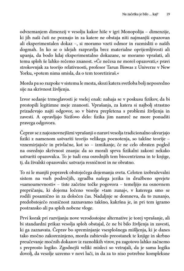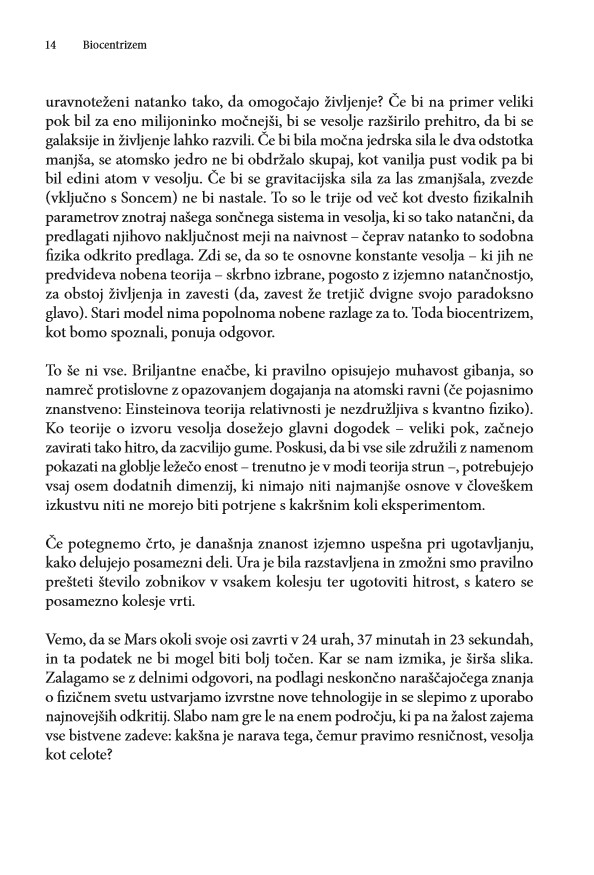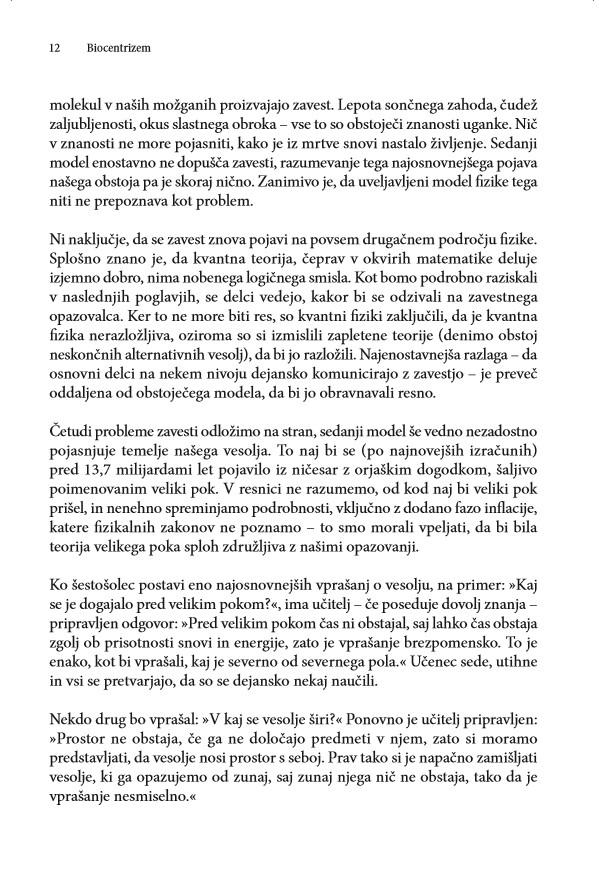 Naše razumevanje vesolja kot celote se je znašlo na mrtvi točki, trdi dr. Lanza, ki področja znanosti preučuje že več kot štiri desetletja. O pomenu kvantne fizike se razpravlja vse od njenega odkritja v tridesetih letih prejšnjega stoletja, pa vseeno danes nismo prav nič bližje njenemu razumevanju kot takrat, ‘teorije vsega’, ki so jo že pred desetletji obljubljali, pa prav tako še vedno ni na vidiku. Z nedokazanimi in nedokazljivimi rešitvami je obtičala v abstraktni matematiki teorije strun.
