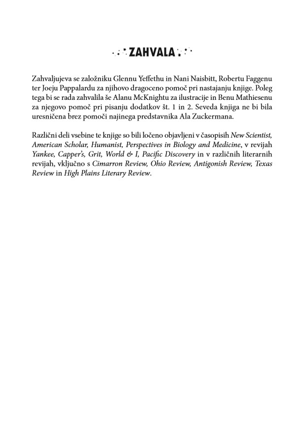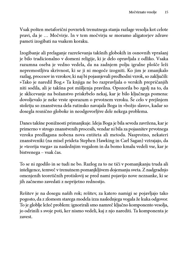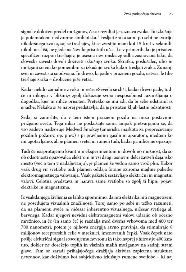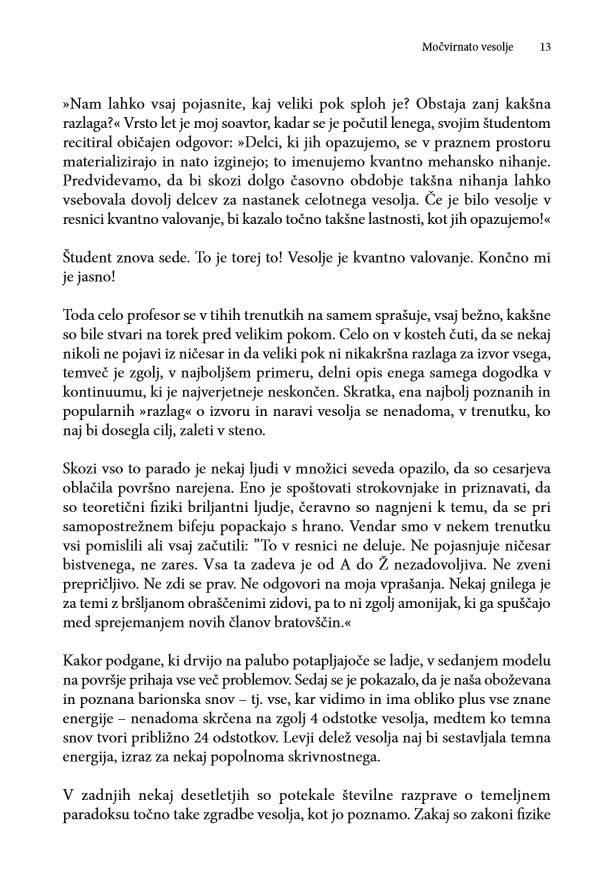 Knjiga nas popelje na dozdevno neverjetno, a navsezadnje neizogibno potovanje skozi čudaško vesolje – naše lastno – in ob tem poruši vse priučene ideje o življenju, času, prostoru in celo smrti. V nas prebudi čut za nove razsežnosti in nam ponudi toliko svežih ter vznemirjajočih perspektiv, da ne bomo na svet nikdar več gledali z istimi očmi.
