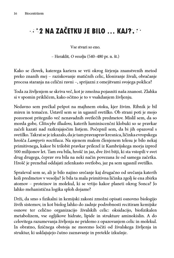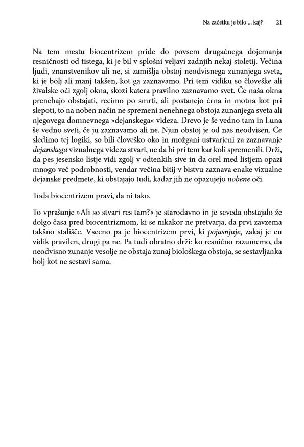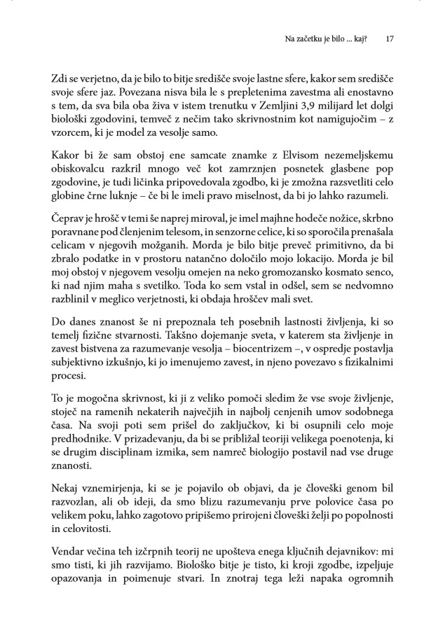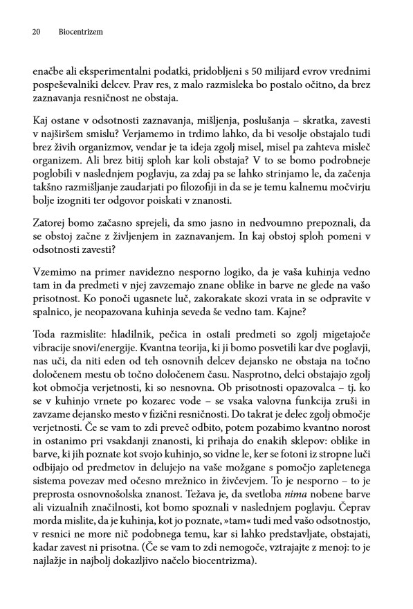 Priznavanja vloge zavesti in živega na področjih, za katere se je pred tem domnevalo, da tam vladajo le fizikalni zakoni, so se že začela množiti in avtorja upata, da se bo to nadaljevalo, vse dokler ne postanejo uveljavljena paradigma, ne pa nadležne stranske opombe. Pričujoča knjiga je obenem tudi povabilo raziskovalcem raznolikih področij, da biocentrizem vključijo v svoje delo. V knjigi so ponujene tako kratkoročne kot dolgoročne priložnosti: po eni strani za dokazovanje biocentrične lastne resnice, po drugi strani pa kot odskočna deska za osmišljanje vidikov bioloških in fizikalnih znanosti, ki se v tem trenutku zdijo nerazrešljivi.