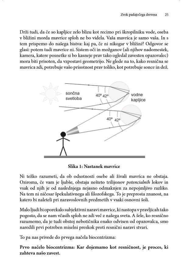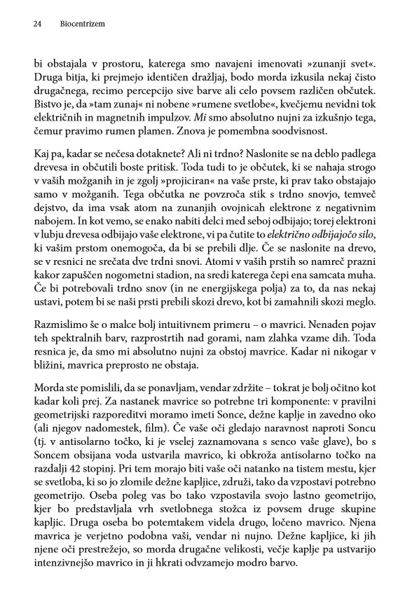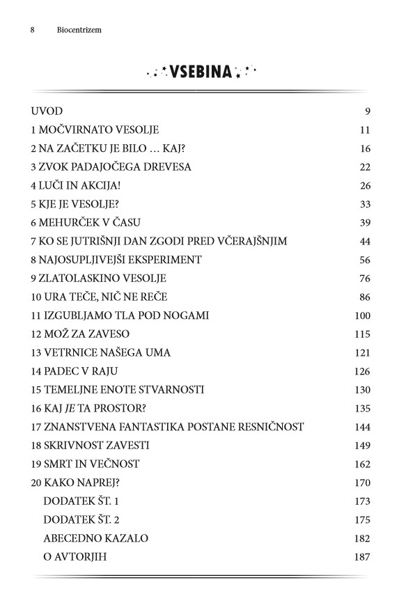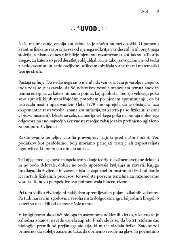 V knjigi skozi oči biologa in astronoma odklenemo kletko, v katero se je zahodna znanost nevede uspela zapreti. V njej eden vodilnih znanstvenih umov na svetu, biolog Robert Lanza, skupaj s priljubljenim fizikom Bobom Bermanom predlaga novo perspektivo: sedanje teorije o fizičnem svetu ne delujejo in ne bodo delovale, dokler ne bodo upoštevale življenja in zavesti. Knjiga predlaga, da življenje in zavest nista le zapoznel in postranski izid milijarde let mrtvih fizikalnih procesov, temveč sta povsem temeljna za razumevanje vesolja. To novo perspektivo sta avtorja poimenovala biocentrizem.