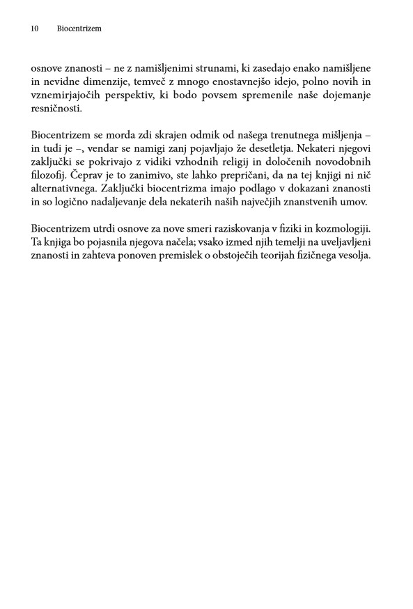 Biocentrizem se na prvi pogled morda zdi skrajen odmik od našega trenutnega mišljenja – in tudi je –, vendar se namigi zanj v znanosti pojavljajo že desetletja. Nekateri njegovi zaključki se pokrivajo z vidiki vzhodnih religij in določenih novodobnih filozofij. Čeprav je to nadvse zanimivo, na tej knjigi ni nič alternativnega. Zaključki biocentrizma imajo podlago v dokazani znanosti in so logično nadaljevanje dela nekaterih naših največjih znanstvenih umov.