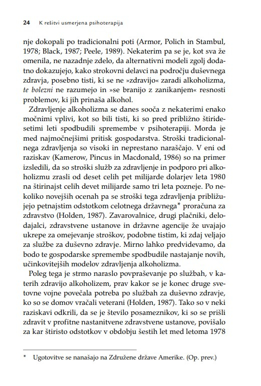 Čeprav izgleda k rešitvi usmerjeni način dela preprost, se ga ni enostavno naučiti, ker postavlja pod vprašaj medicinski model zdravljenja zasvojenosti. Neločljivo je povezan z razvojem postmodernizma in narativnih pristopov, za katere je značilen premik od individualne k relacijski, interakcijski in kontekstualni perspektivi ter od patologije k salutologiji, uveljavljanje aktivnejše vloge terapevta, premik težišča obravnave s klientove preteklosti na sedanjost in prihodnost, opuščanje velikih teorij, kot je bila psihoanaliza, na račun večjega upoštevanja razlag vsakega posameznega klienta, predvsem pa prizadevanje za klientovo opolnomočenje v vlogi soustvarjalca terapevtskega procesa in ključnega akterja terapevtske spremembe.