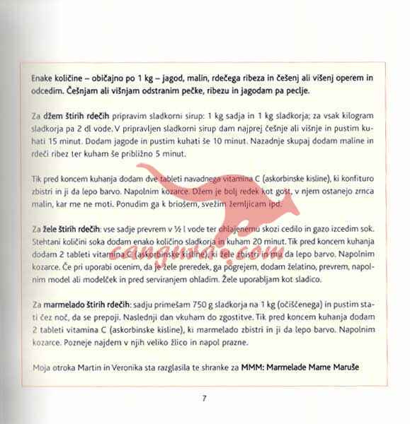 Še vedno obstajajo, stvari, ki jih ni mogoče kupiti – Enostavno jih moraš narediti sam. Doma narejene marmelade predstavljajo višek vsakega zajtrka. V knjigi, ki je pred vami, vam ponujamo več kot 80 slastnih receptov, ki so sestavljeni tako razumljivo, da se kuhanja marmelade lahko lotijo tudi manj vešče roke. Na pomlad se lotite kuhanja češnjeve, jagodne ali višnjeve marmelade, poleti brusnične, korenjeve ali marmelade iz melone in malin, jeseni grozdne, kostanjeve ali pa naredite jabolčno usnje in z njim razveselite sladkosnede otroke. Zimski zajtrk bo doživetje zase, če boste na mizo postavili božično marmelado, marmelado iz banan in čokolade, limonovo marmelado s kokosom ali čebulno marmelado s timijanom. Posebna poslastica pa so želeji, ki jih lahko uporabite kot marmelado, prilogo k mesu ali sladico. Za sadje v alkoholu pa ni potrobno posebnih napotkov kako ga porabiti, mar ne?