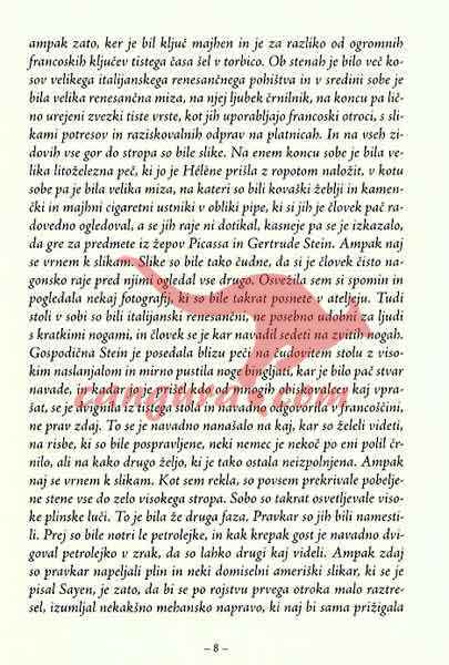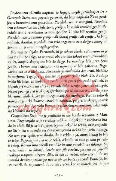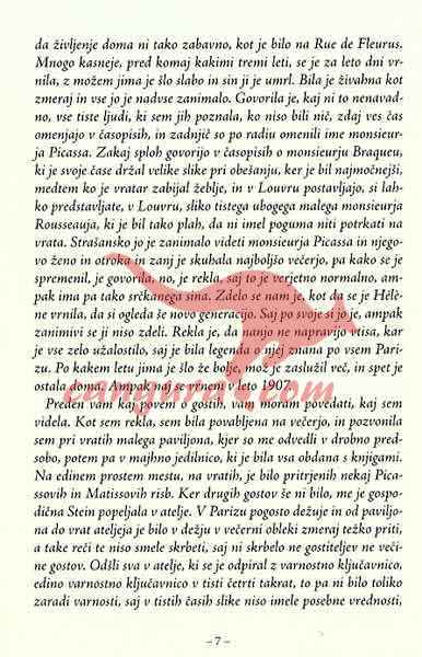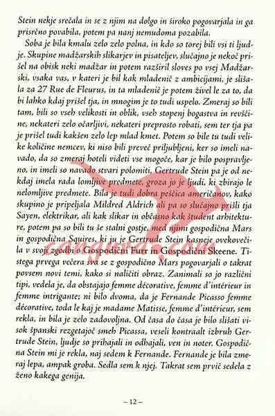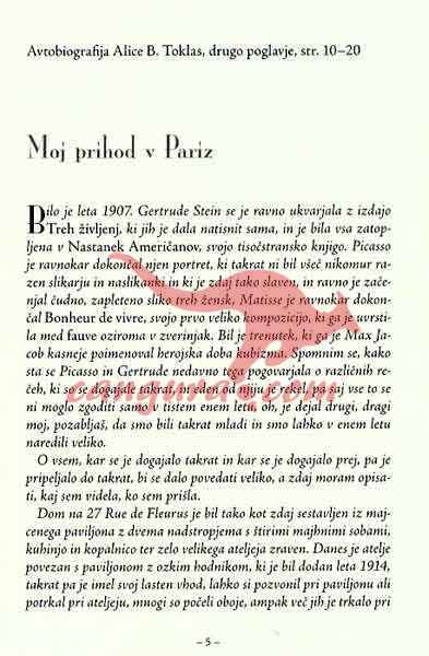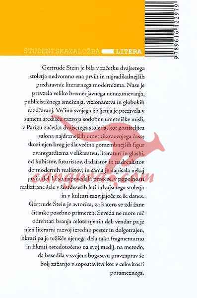 Gertrude Stein je bila v začetku dvajsetega stoletja nedvomno ena prvih in najradikalnejših predstavnic literarnega modernizma. Nase je prevzela veliko breme: javnega nerazumevanja, publicističnega smešen ja, vizionarstva in globokih razočaranj. Večino svojega življenja je preživela v samem središču razvoja sodobne umetniške misli, v Parizu začetka dvajsetega stoletja, kot gostiteljica salona najdrznejših umetnikov svojega časa, skozi njen krog je šla večina pomembnejših 6.gur