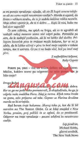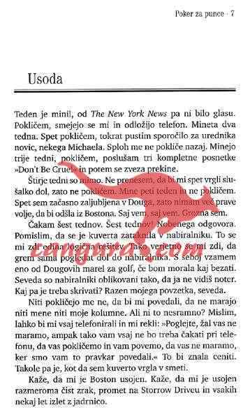 Poker za punce je ženski roman a je pisan dovolj pogumno, zabavno in naravnost, da ga zlahka prenese tudi kriticni moški bralec. Tudi zgodba je dovolj moška, ceprav v njej nastopajo štiri ženske, ki se srecujejo na vecerih pokra in se tam obnašajo natanko tako kot to pocnejo moški…