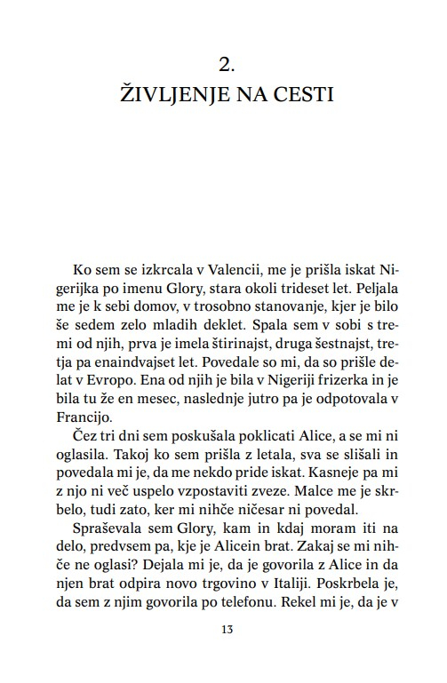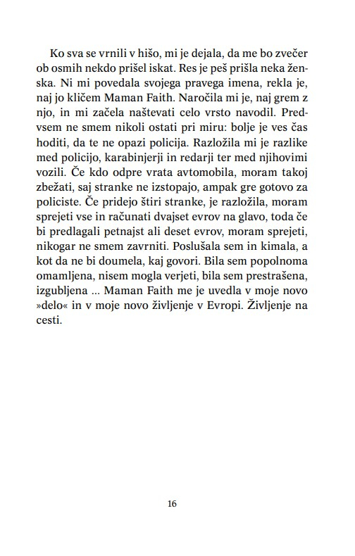 Knjiga je napisana preprosto, a ravno zaradi tega začutimo vse trpljenje, ki ga okušajo ta uboga dekleta, prisiljena prodajati svoje telo. Mlada Nigerijka Blessing Okoeidon je s to knjigo dala glas vsem žrtvam trgovine z ljudmi. Na različne načine jim pomaga tudi v procesu reintegracije v družbo. Obiskuje šole v Italiji in potuje po svoji domovini Nigeriji, kjer v revnih in oddaljenih predelih države izobražuje ženske in dekleta o trgovini z belim blagom.