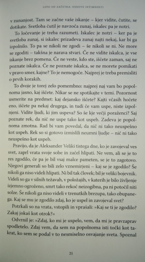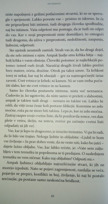 Eden od največjih duhovnih učiteljev 20. stoletja v Intimnosti deli svojo modrost o ustvarjanju ljubečih odnosov. Nežno in sočutno nas popelje k vpogledu v to, kaj pomeni pripravljenost za resnično intimnost, odprtost in medsebojno zaupanje. Pomaga nam tudi prepoznati, zakaj se tako zelo bojimo intimnosti, kako preseči te strahove, opustiti svoje obrambne mehanizme in podpreti odnos s še več odprtosti, iskrenosti in zaupanja.