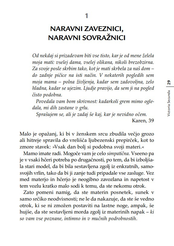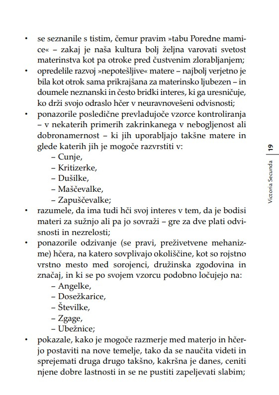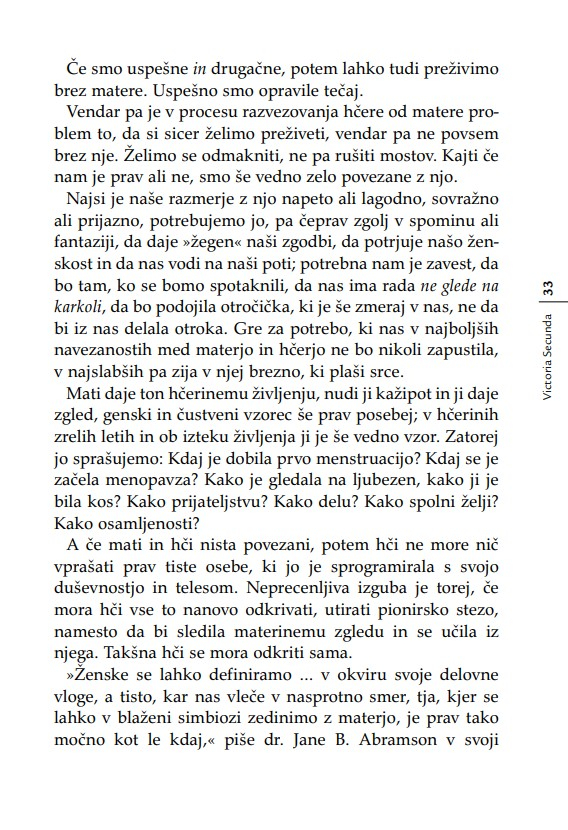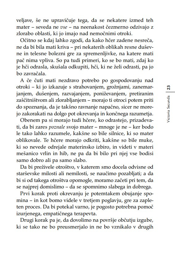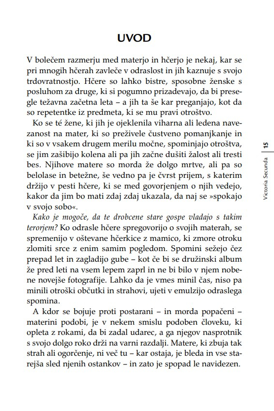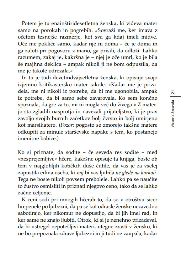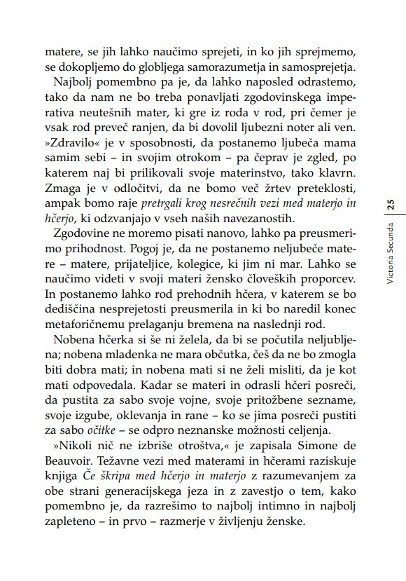 »Otrok je v razmerju s starši, ne glede na leta, ves čas v povsem podrejenem položaju. Nekoč sem to dejstvo strnil v ugotovitev, da lahko starši otroka kadarkoli strpajo v norišnico, otrok pa staršev nikoli – niti ko starostna demenca povzroča družini kar se da hudo škodo. Secundina knjiga je enkratna zaradi tega, ker ta problem obravnava iz perspektive hčere. Opredeljuje ‘materinski mit’ oziroma tabu, ki prepoveduje hčeri, da bi gojila povsem upravičena negativna čustva v zvezi z ne dovolj dobro materjo.