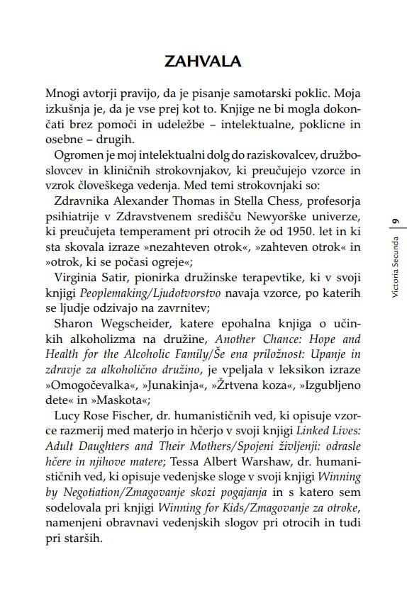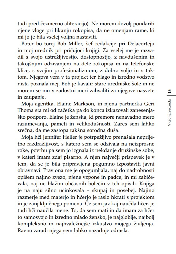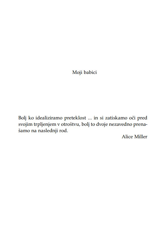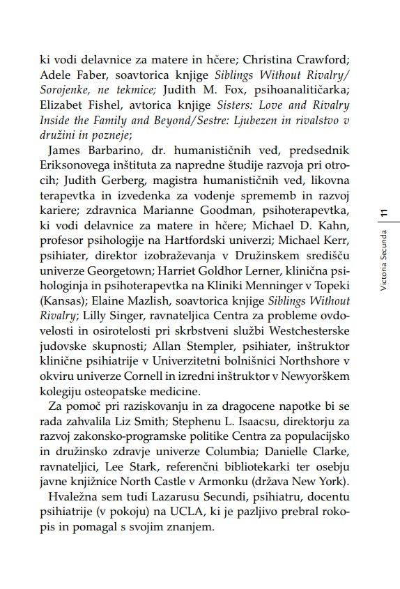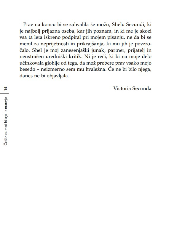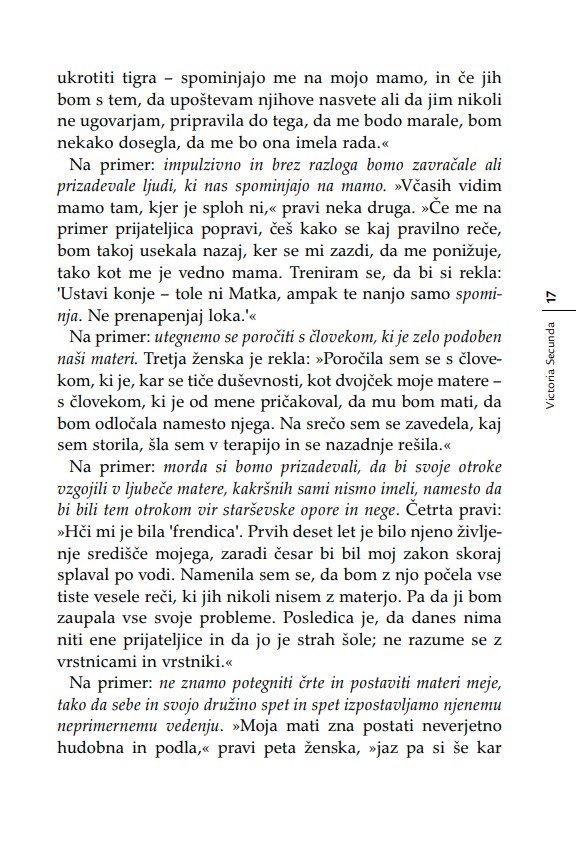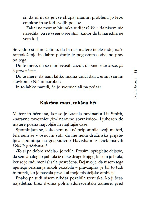 »Otrok je v razmerju s starši, ne glede na leta, ves čas v povsem podrejenem položaju. Nekoč sem to dejstvo strnil v ugotovitev, da lahko starši otroka kadarkoli strpajo v norišnico, otrok pa staršev nikoli – niti ko starostna demenca povzroča družini kar se da hudo škodo. Secundina knjiga je enkratna zaradi tega, ker ta problem obravnava iz perspektive hčere. Opredeljuje ‘materinski mit’ oziroma tabu, ki prepoveduje hčeri, da bi gojila povsem upravičena negativna čustva v zvezi z ne dovolj dobro materjo.