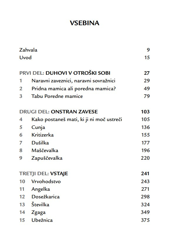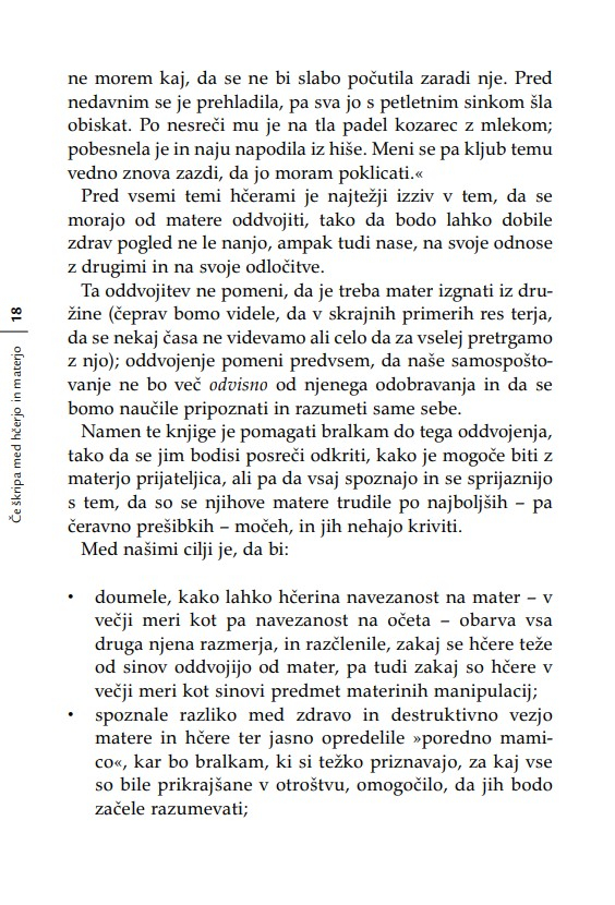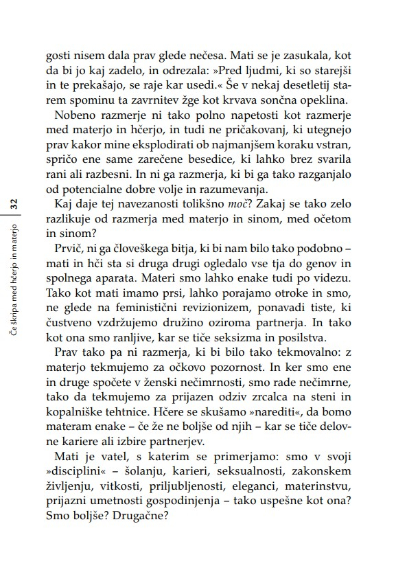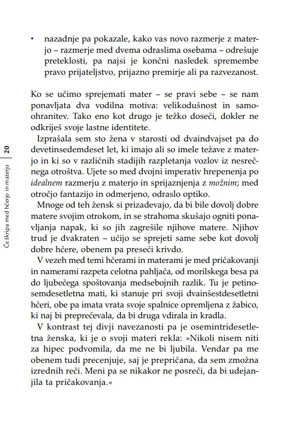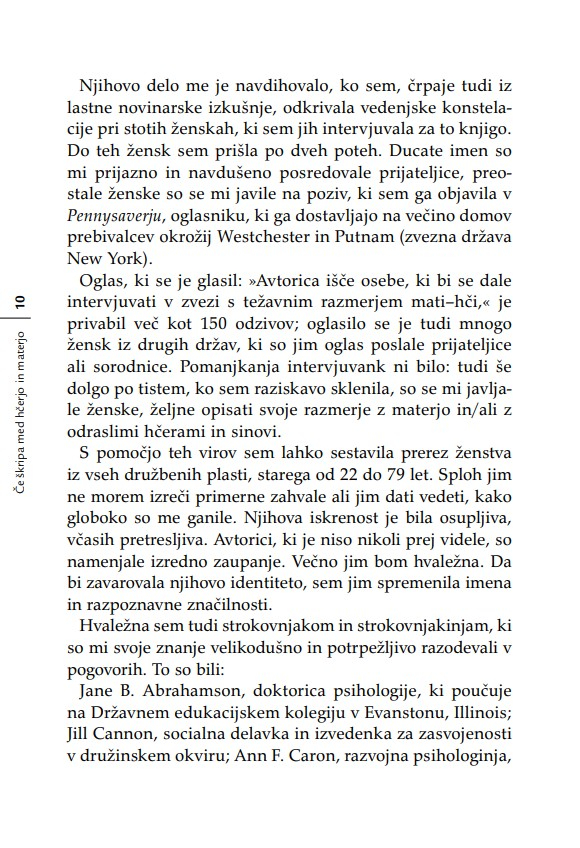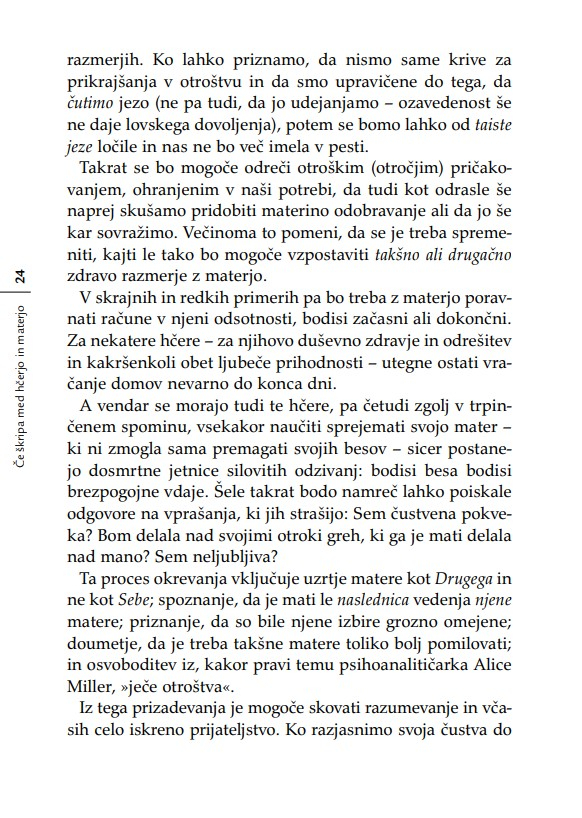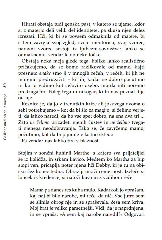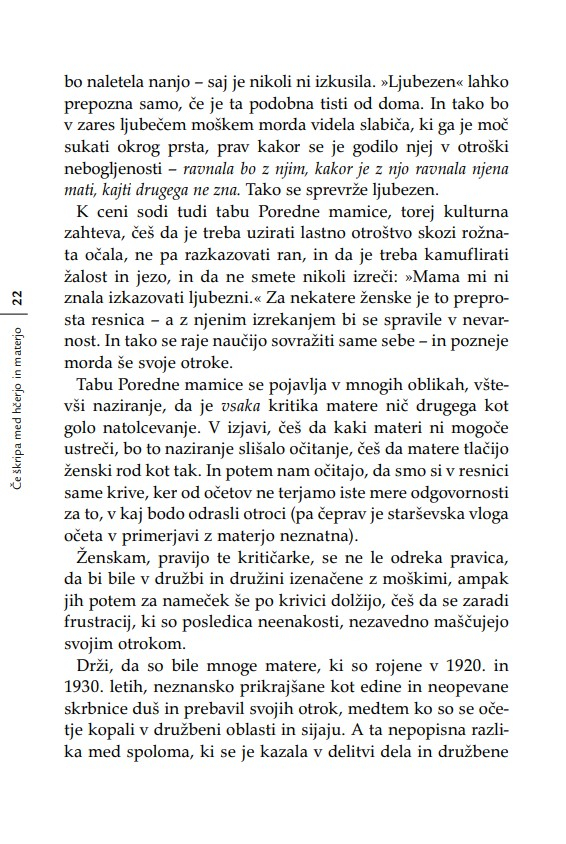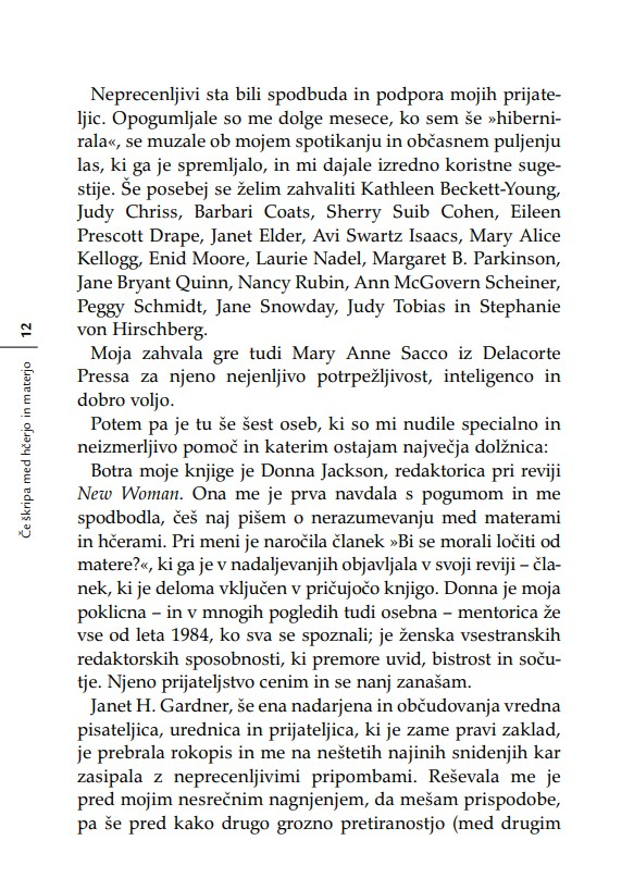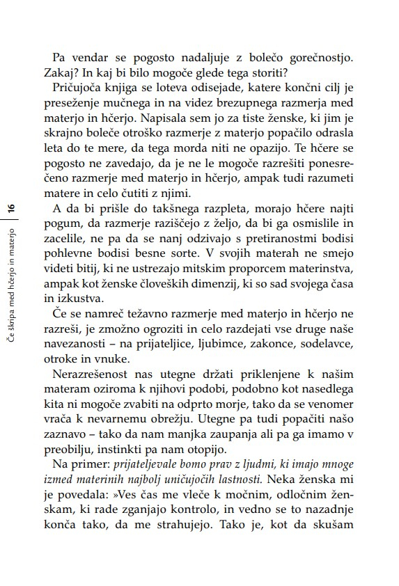 Nobena hčerka si še ni želela, da bi se počutila neljubljena; nobena mladenka ne mara občutka, češ da ne bo zmogla biti dobra mati; in nobena mati si ne želi misliti, da je kot mati odpovedala. Kadar se materi in odrasli hčeri posreči, da pustita za sabo svoje vojne, svoje pritožbene sezname, svoje izgube, oklevanja in rane – ko se jima posreči pustiti za sabo očitke – se odpro neznanske možnosti celjenja. ‘Nikoli nič ne izbriše otroštva,’ je zapisala Simone de Beauvoir. Težavne vezi med materami in hčerami raziskuje knjiga Če škripa med hčerjo in materjo z razumevanjem za obe strani generacijskega jeza in z zavestjo o tem, kako pomembno je, da razrešimo to najbolj intimno in najbolj zapleteno – in prvo – razmerje v življenju ženske.«