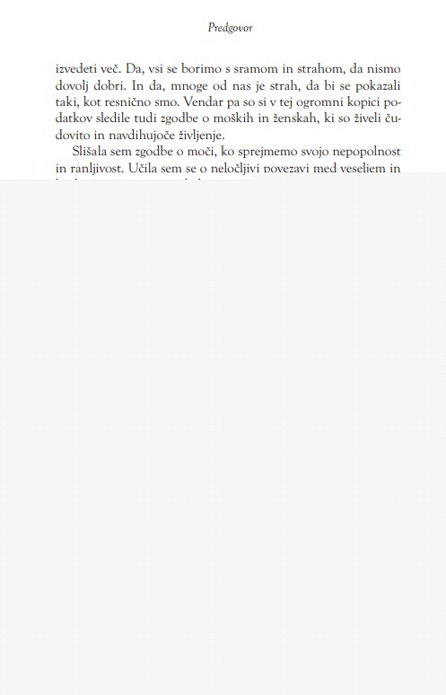 Brené Brown, strokovnjakinja za sram in strah, nam v tej knjigi ne ponuja hitrih rešitev, uči pa nas o vseživljenjskem potovanju od ‘Kaj neki si bodo ljudje mislili?’ do ‘Zadosten/na sem«.