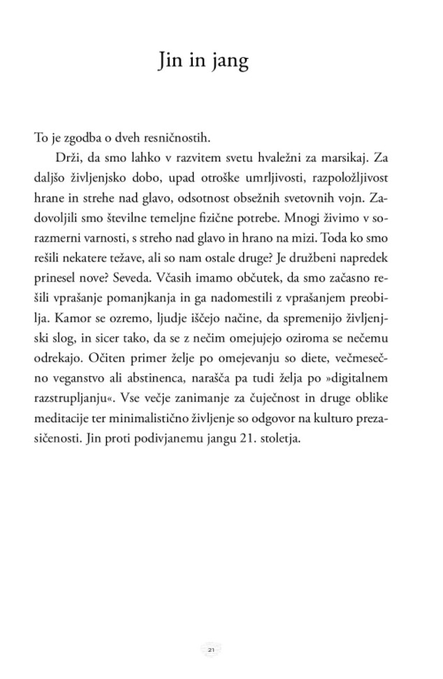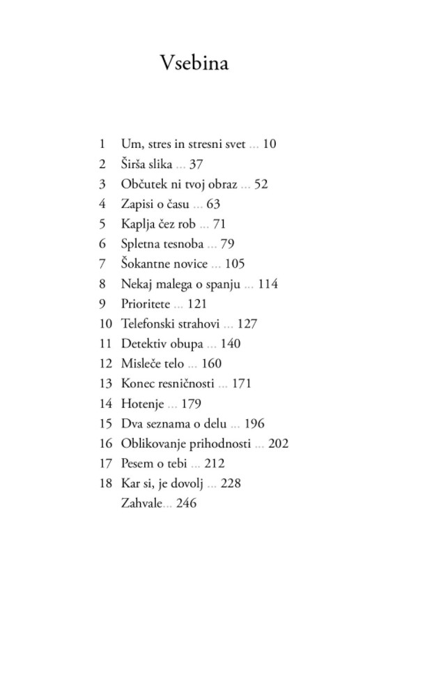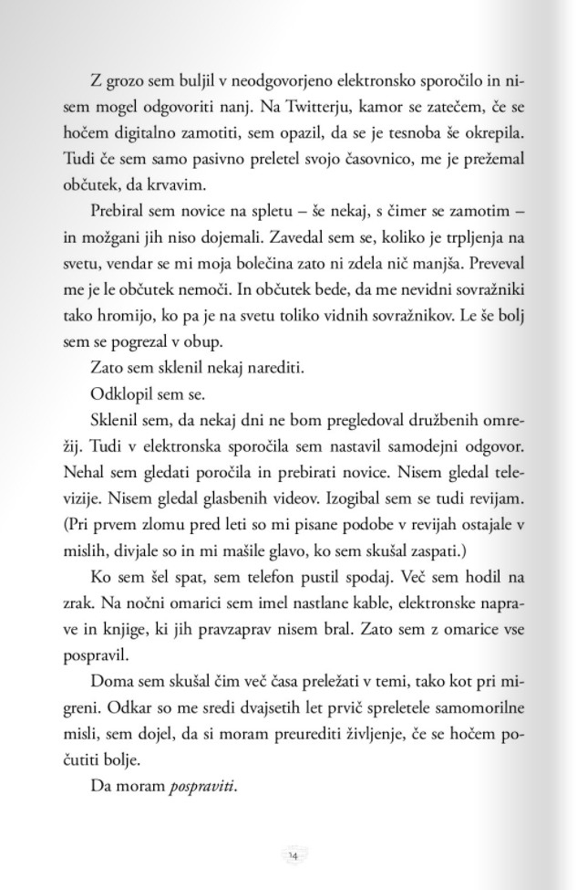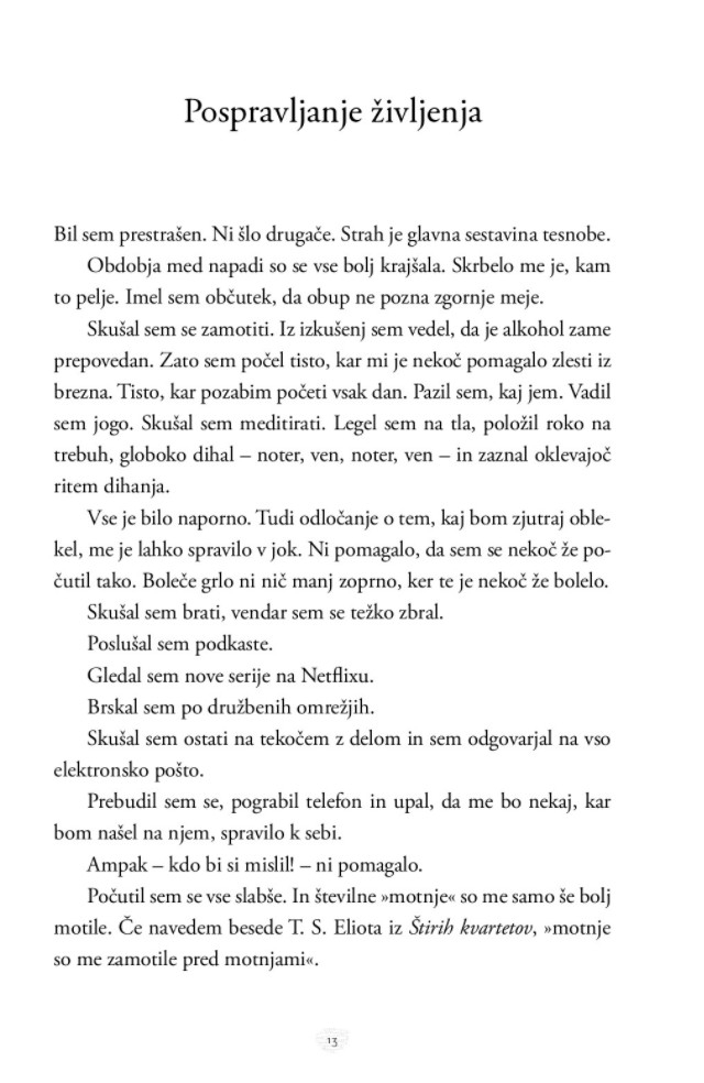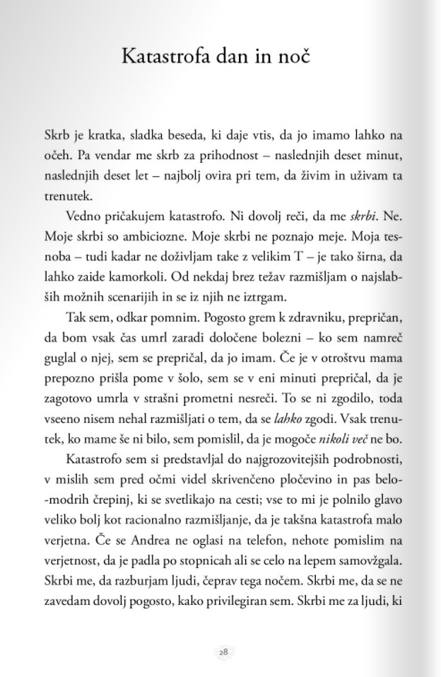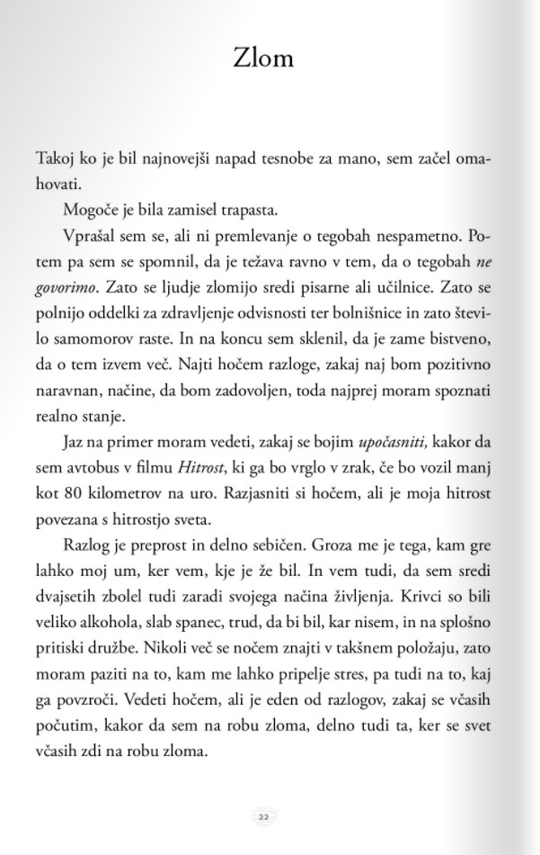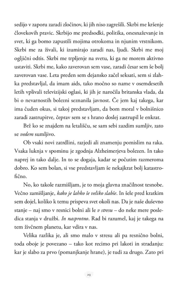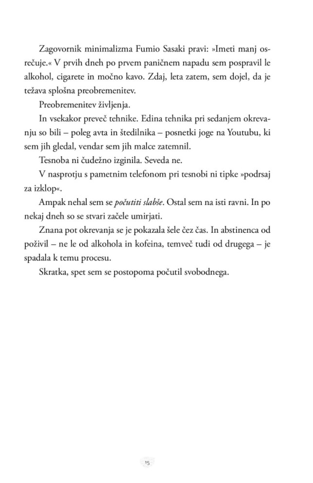 S spretnostjo sijajnega pisatelja in neposrednostjo navadnega človeka v kratkih, duhovitih in neskončno iskrenih zapisih razmišlja o velikih in malih rečeh, ki nam rušijo duševni mir. In se sproti tudi sam uči, kako spet postati cel.