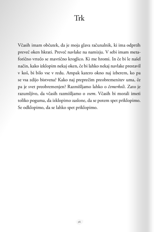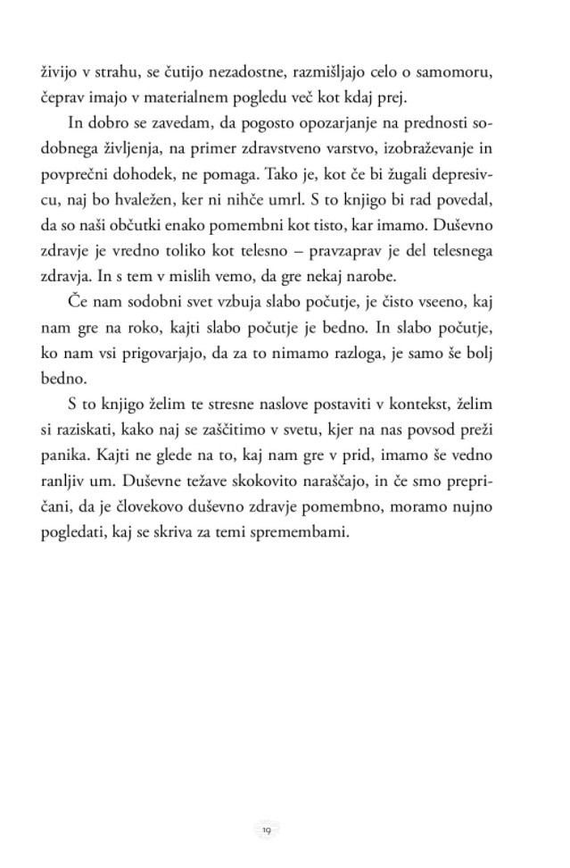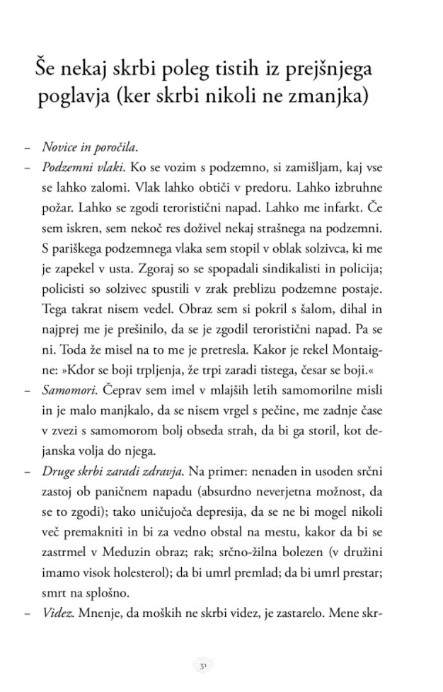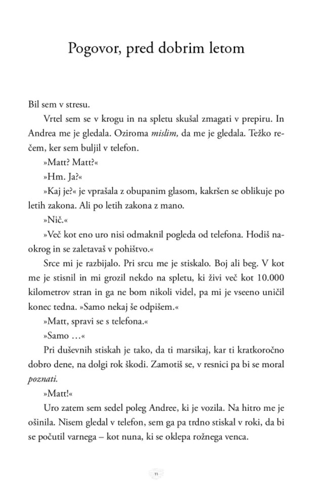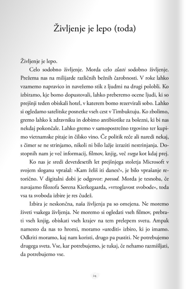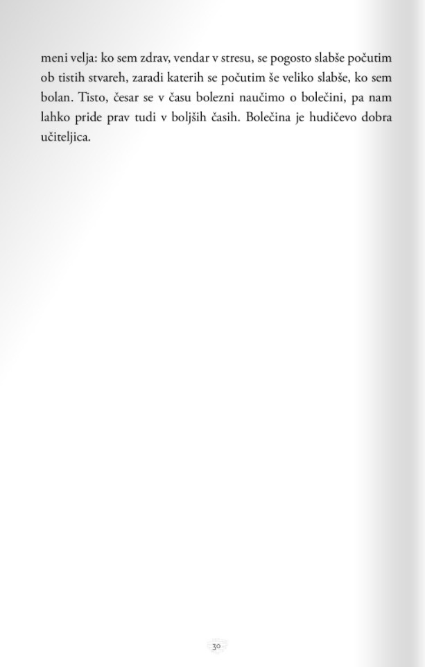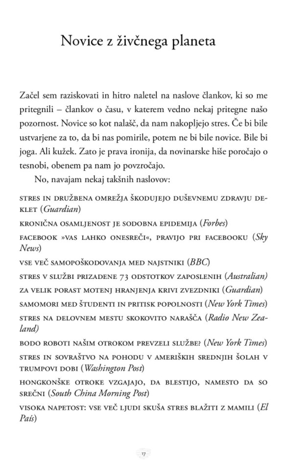 S spretnostjo sijajnega pisatelja in neposrednostjo navadnega človeka v kratkih, duhovitih in neskončno iskrenih zapisih razmišlja o velikih in malih rečeh, ki nam rušijo duševni mir. In se sproti tudi sam uči, kako spet postati cel.