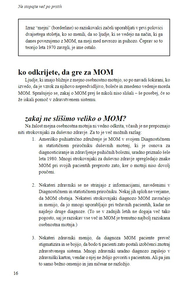 Knjiga, ki sta jo napisala Randi Kreger, ustanoviteljica internetne skupnosti BPD Central in psihoterapevt Paul T. Mason vam bo na preprost, zanimiv in strokoven način pomagala, da boste končno razumeli obnašanje vašega bližnjega in našli smisel v kaosu, ki vas obdaja. V njej se prepletajo tudi številne zgodbe, tako tistih oseb, ki imajo MOM, kot njihovih bližnjih, ponuja pa tudi mnogo strategij, s katerimi boste lahko postavili meje nemogočim zahtevam in pričakovanjem vašega bližnjega, zmanjšali konfliktne situacije, izstopili iz čustvenih viharjev ter ponovno obvladovali svoje življenje.