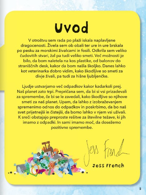 Skrb za okolje bi morala biti vsem nam na prvem mestu Knjiga ponudi prenekatero ekološko idejo in dejstva, pred katerimi si ne smemo zatiskati oči. Ena od bolj črnogledih napovedi je tudi ta, da bi naj bilo do leta 2050 v oceanih več kosov plastike kot rib.