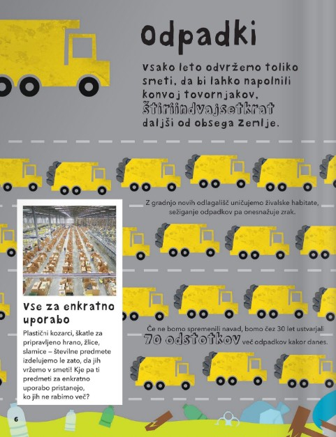 S skoraj vsemi dejavnostmi ustvarjamo odpadke, ki pa so za planet zelo škodljivi. Knjiga odkriva in obravnava vse vrste odpadkov – od ostankov hrane, elektronskih odpadkov, plinov iz tovarn in starih naprav, »večno« plastiko – pa tudi, kako lahko poskušamo težavo zmanjšati, obnavljamo energijo in varujemo naravo.