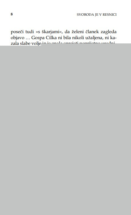 Zase pravi, da je doživela marsikaj lepega, a tudi mnogo težkih dni, ki bi bili lahko lepši in bogatejši, če bi se vsi trudili za iste cilje. Pisanje pa ji je v tem pogledu vedno predstavljalo svojevrstno olajšanje in način za ohranjanje zdravega pogleda na svet in na življenje. Tudi zato je v svojih prispevkih, zlasti v Družini, pa tudi v Ognjišču in Demokraciji, ves čas težila za resnico in pravico.