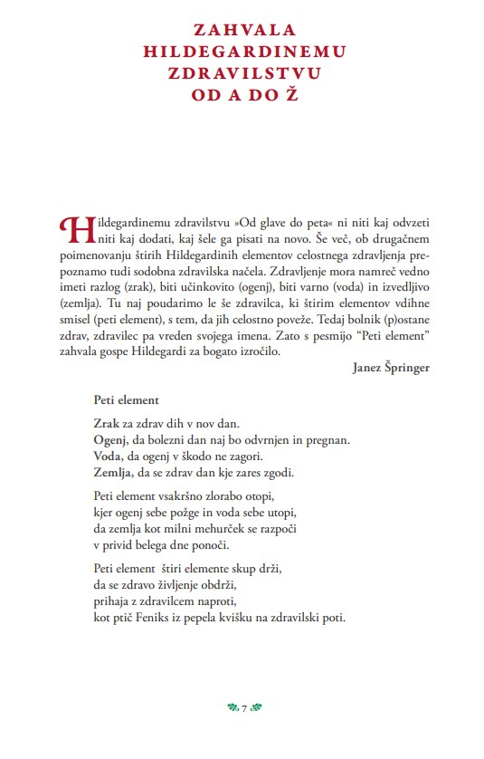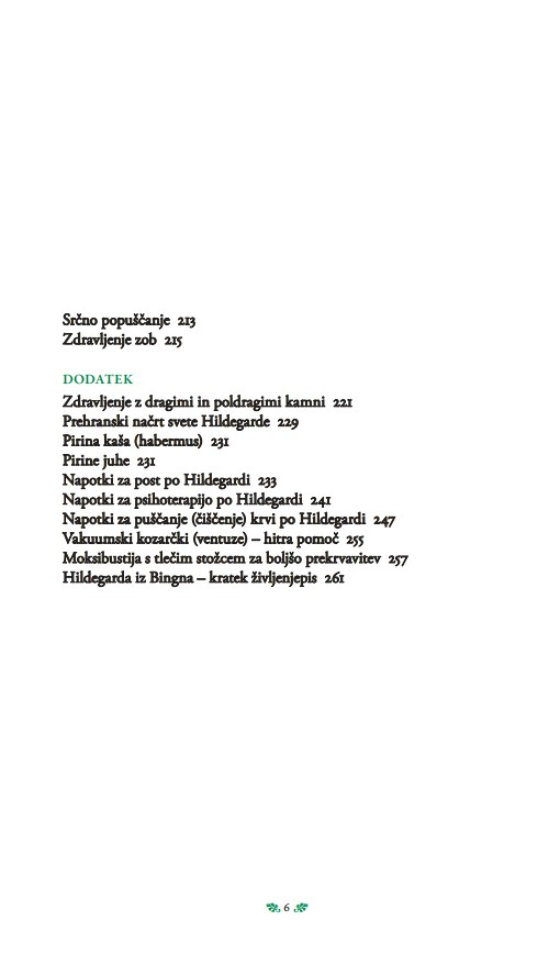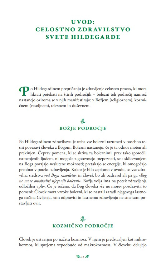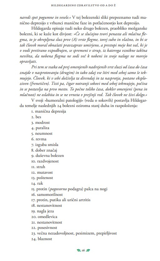 V nadaljevanju so naštete bolezni in obilica receptov za odpravljanje težav s čaji, prelivi, obkladki, kopelmi, inhalacijami itd. V knjigi je med drugim opisano tudi zdravljenje z dragimi in poldragimi kamni ter navodila za post – z nasvetom, kako se ga lotimo in kako ga izpeljemo; ter še številni drugi nasveti za lajšanje tegob.