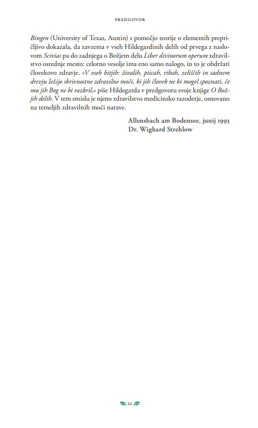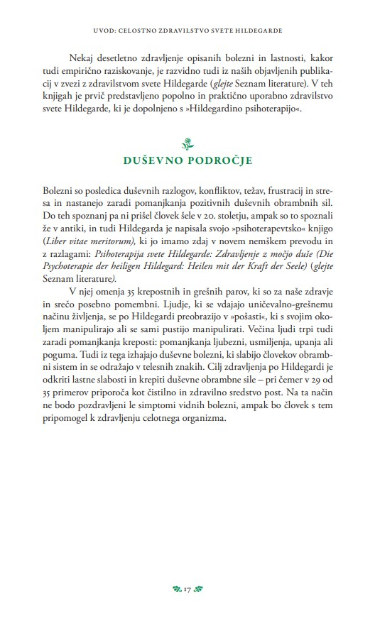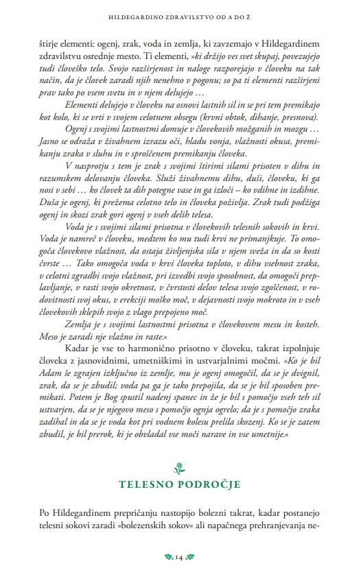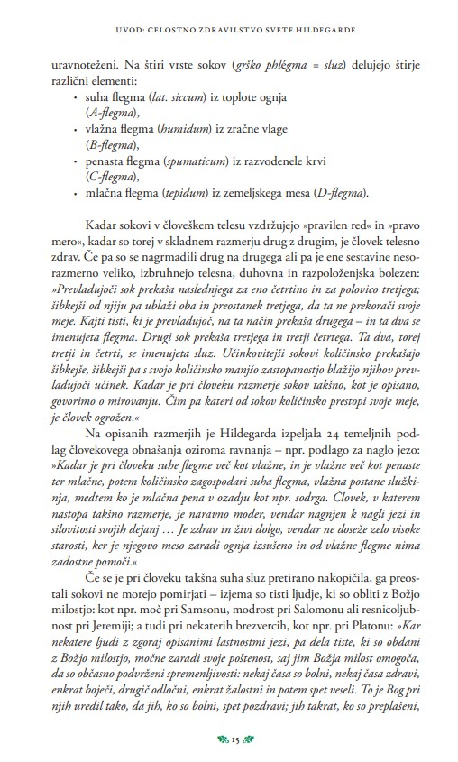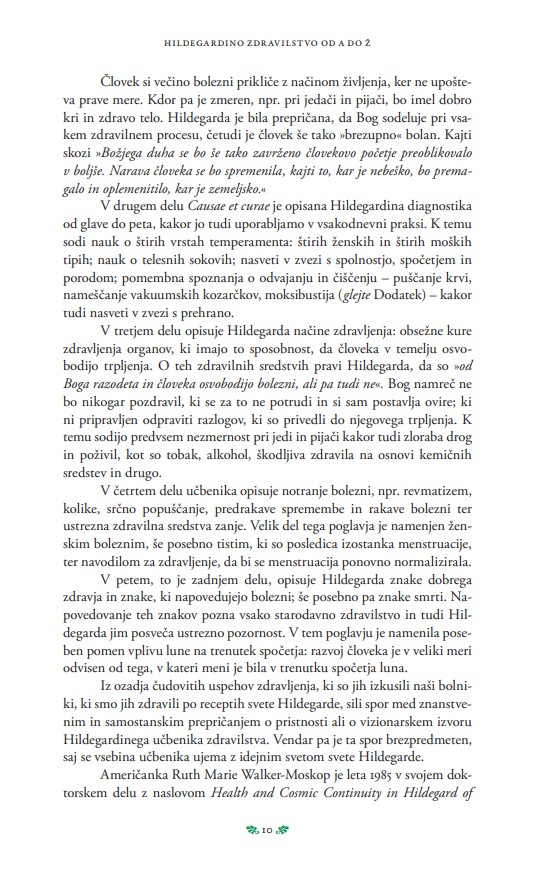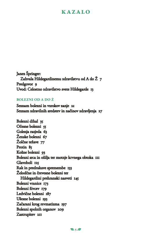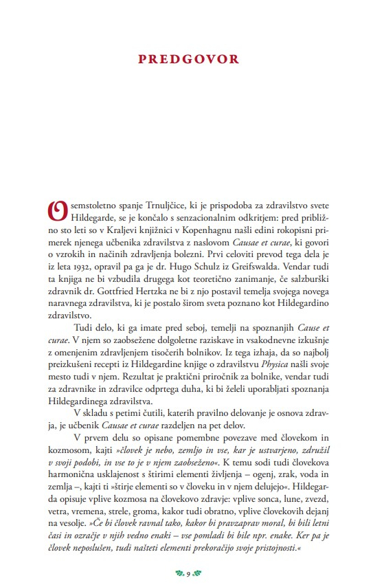 V izredno pregledni knjigi je zajeto celostno zdravilstvo svete Hildegarde. Na začetku knjige boste našli seznam bolezni od A do Ž, sledi seznam zdravilnih sredstev in načinov zdravljenja.