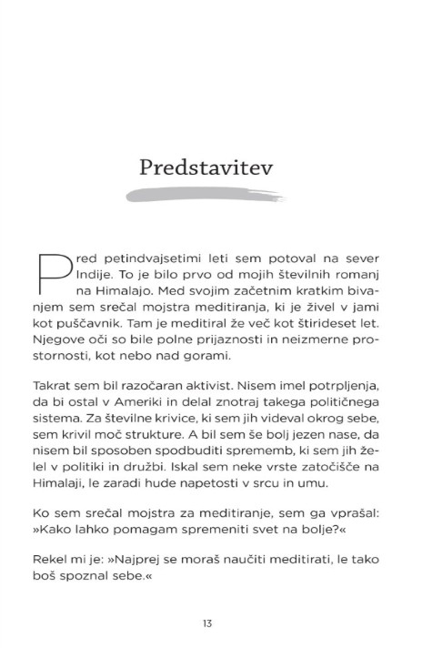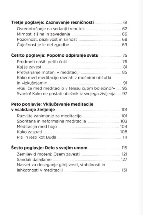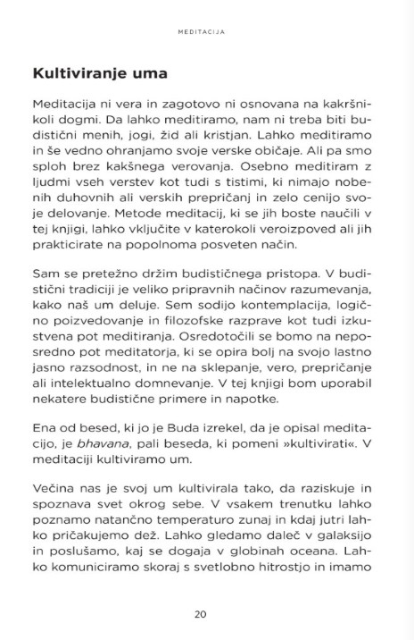 »Meditacija: Spoznajte svoj um je čudovit osvežujoč, dobro oblikovan in praktičen vodič do bogate zbirke meditacijskih vaj iz tibetanske budistične tradicije. Tu razložene vaje, posejane z razsvetljujočimi osebnimi pripovedmi, so bistvene za budizem in so obenem primerne za vse, ki iščejo bolj čuječ, sočuten in smiseln način življenja.«