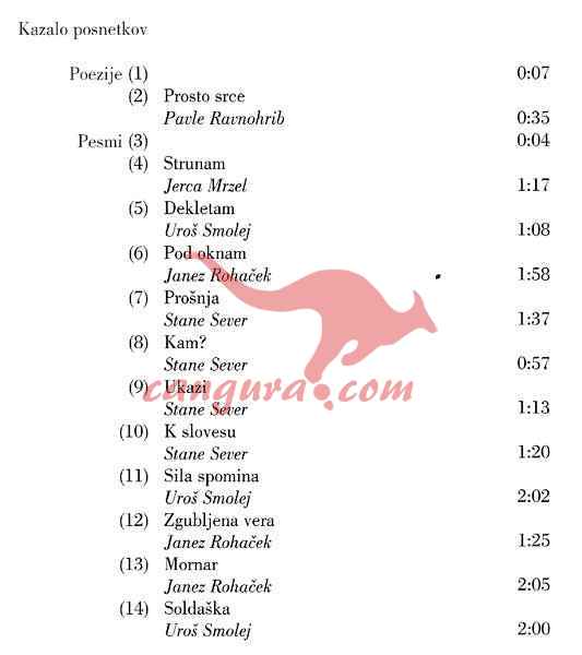 Zvočna knjiga na CD plošči in knjižica z besedili pesmi. Knjižica: 76 strani z besedili vseh pesmi, spremno besedo, kratkimi predstavitvami izvajalcev in njihovimi fotografijami…