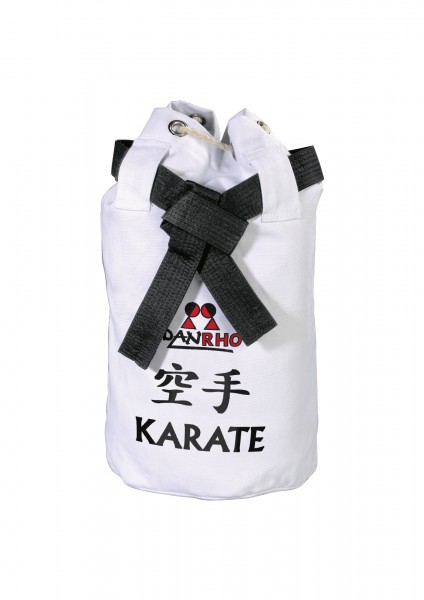 Torbo krasi tudi črn pas ter napis Karate v latinici in japonščini.